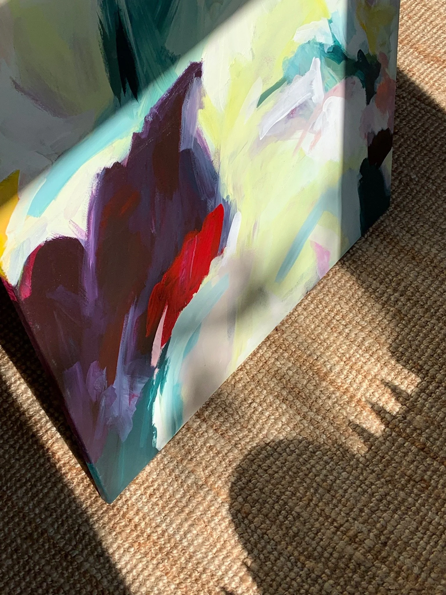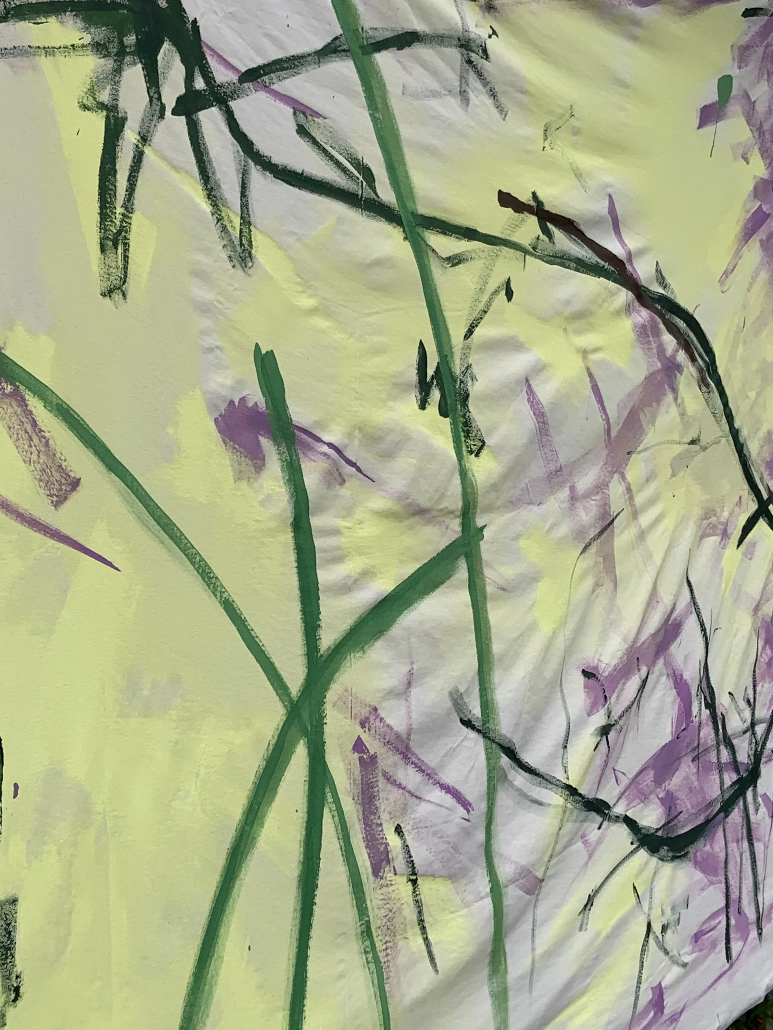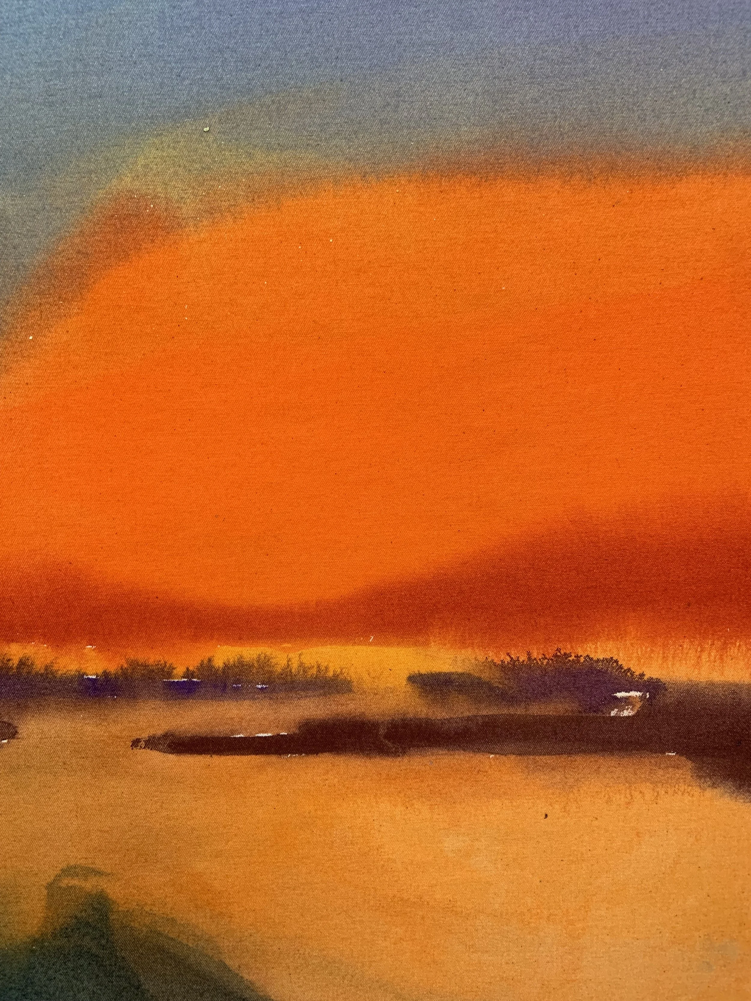 Bei der Soak-Stain Methode werden die Farben auf den umgrundierten und nassen Leinwandstoff aufgetragen. Dadurch dringt die Farbe in das Material ein und gewinnt an Leucht- und Ausdruckskraft.